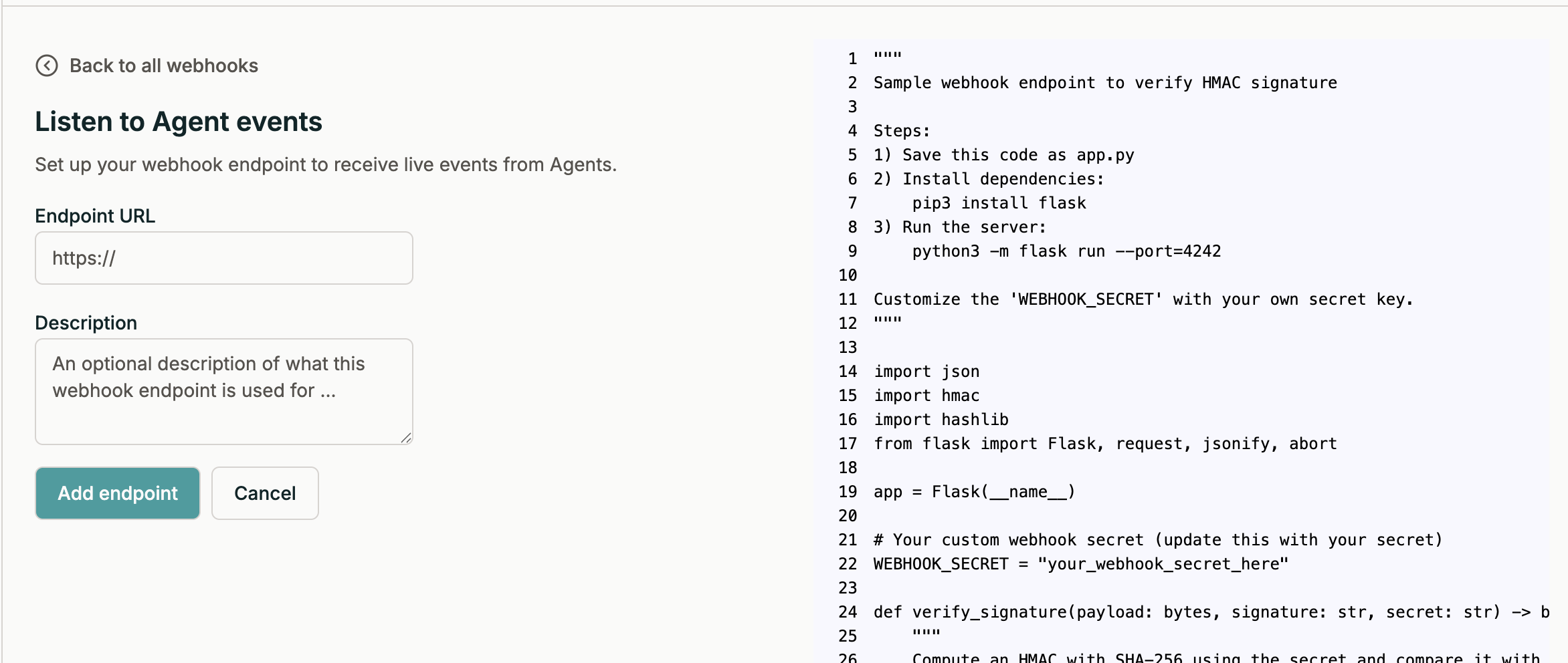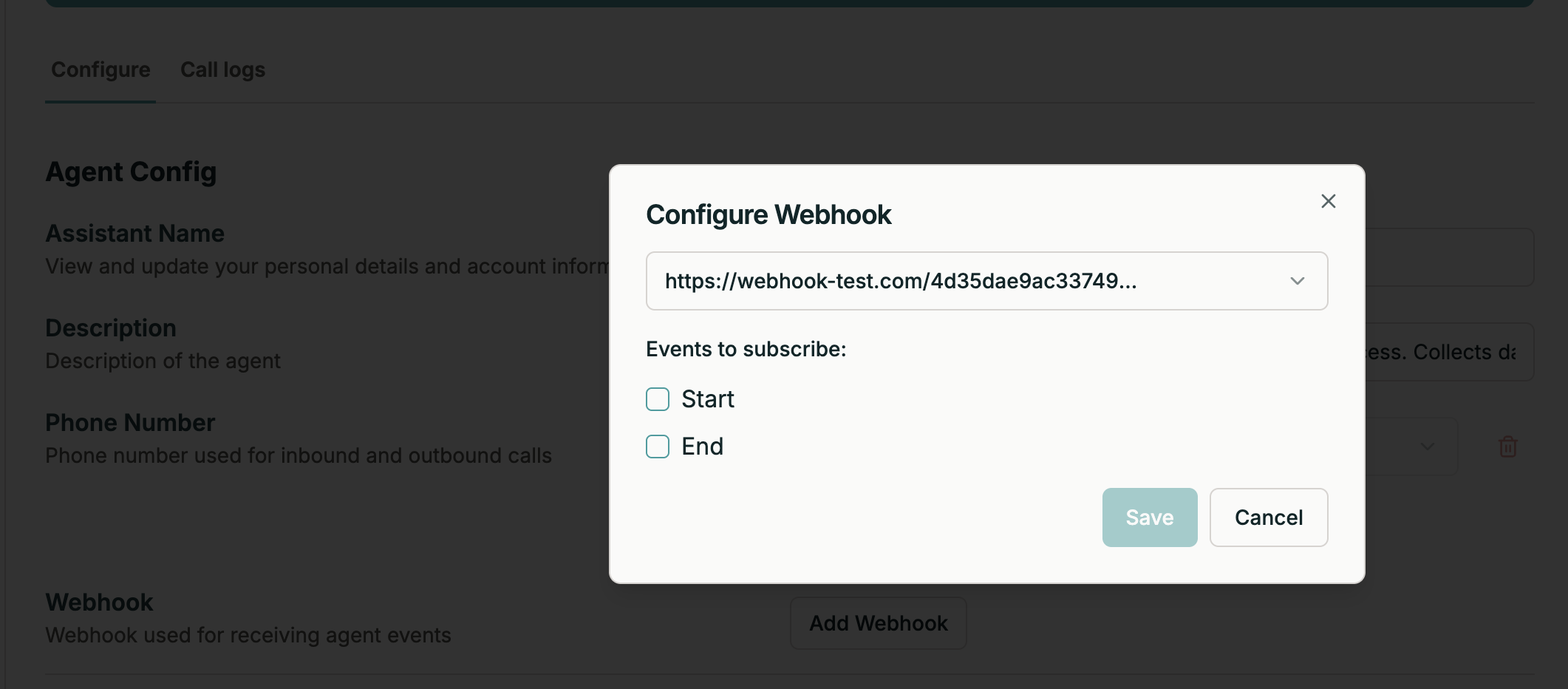 Your webhook will receive the following types of events:pre-conversation: When an agent call beginspost-conversation: When an agent call completesanalytics-completed: When post-call analytics are generated and ready